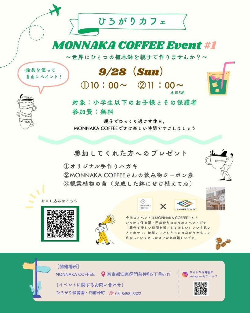 同じ門前仲町エリアのおしゃれなカフェ MONNAKA COFFEEとひろがり保育園・門前仲町のコラボイベントです。